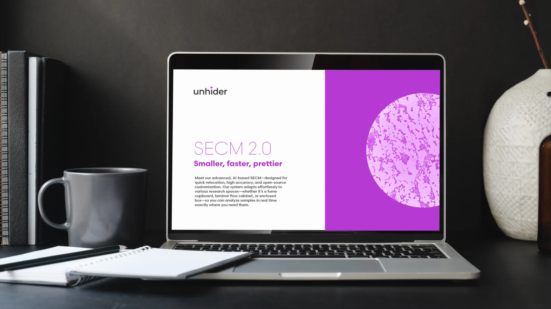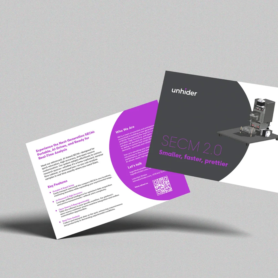 Skenuojančio elektrocheminio mikroskopo (SECM) įvedimas į rinką ir prekinio ženklo sklaida mokslo institucijoms, centrams bei Amerikos entuziastams, besidomintiems moksliniais „žaisliukais“. Sukūrėme pavadinimą, logotipą, vizualinį identitetą ir išleidome klientą į parodą už jūrų marių. Pavadinimas tiksliai perteikia šio mikroskopo esmę – „tas, kuris atidengia nematomą“, „atskleidėjas“, o logotipo grafinis elementas su užkoduota stilizuota akimi vizualizuoja mintį, kad su šiuo aparatu bus „sudėti visi taškai ant i“. Neatsitiktinai pasirinkta violetinė spalva, nes viena jos reikšmių – intuicija, kuri tarsi padeda dar geriau atskleisti tai, kas tiriama.